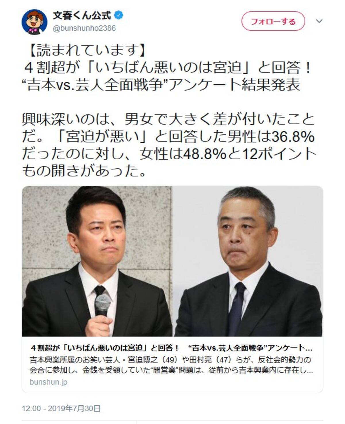 誰がいちばん悪いのか 吉本興業の騒動で週刊文春が緊急アンケート 宮迫博之 との回答が4割超 19年7月30日 エキサイトニュース